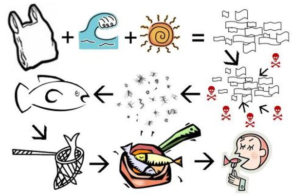 The life cycle of plastic bags and other plastics which become “fugitive” in our environment threatens public health. Plastic does not biodegrade in the environment. Instead, it photo-degrades (breaks down from exposure to sunlight), oxidizes and physically breaks down from wave action. This creates increasingly smaller particles of plastic which absorb pollutants from surrounding water. Because plastics are buoyant, they are carried long distances by marine currents. Plastic particles have been found to transport pollutants to such distant locations as the Arctic and presents the opportunity for bioaccumulation in geographically distant food chains.